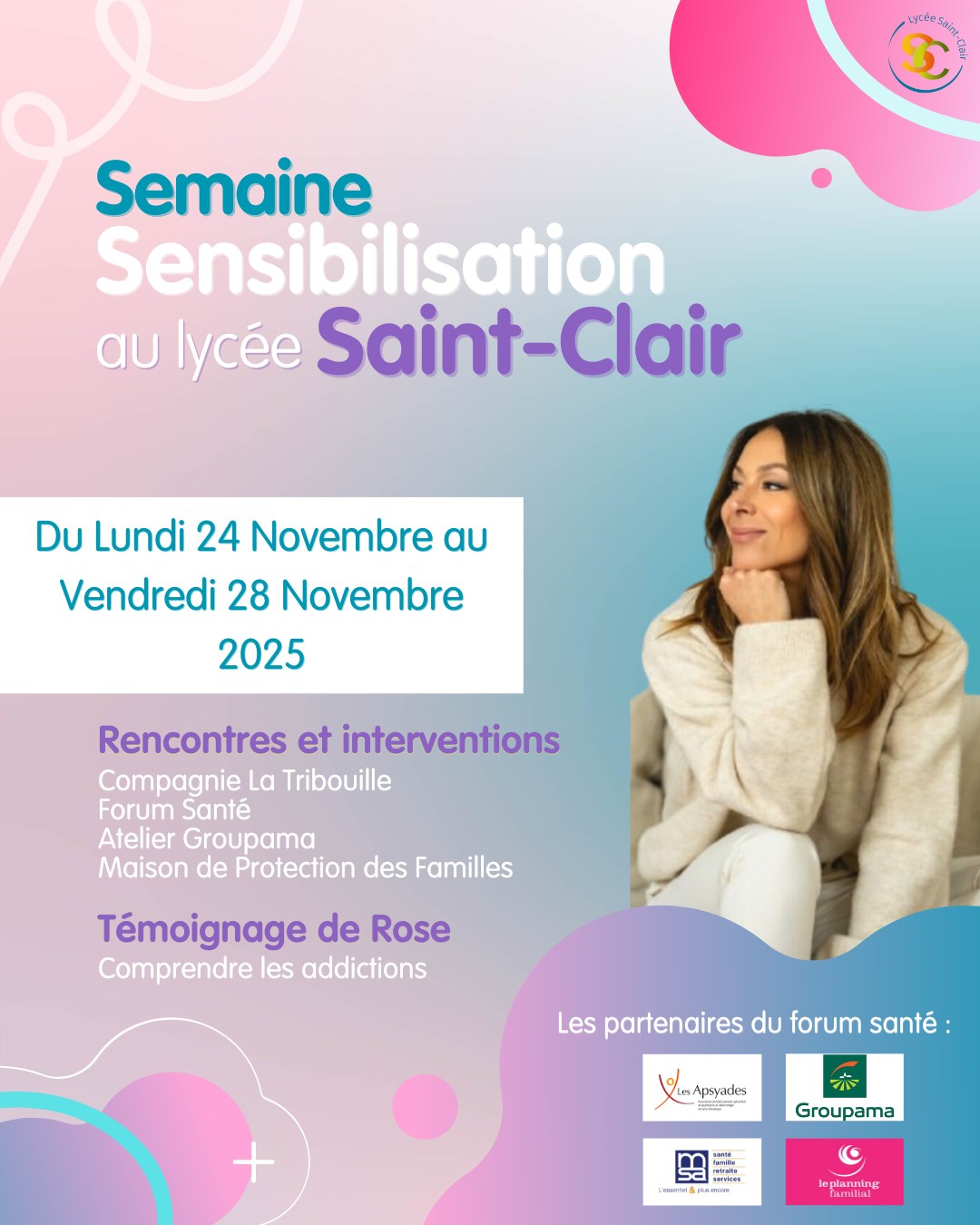 Du lundi 24 au vendredi 28 novembre 2025, le lycée Saint-Clair de Derval (44) organise une semaine dédiée à la prévention et à l’écoute.